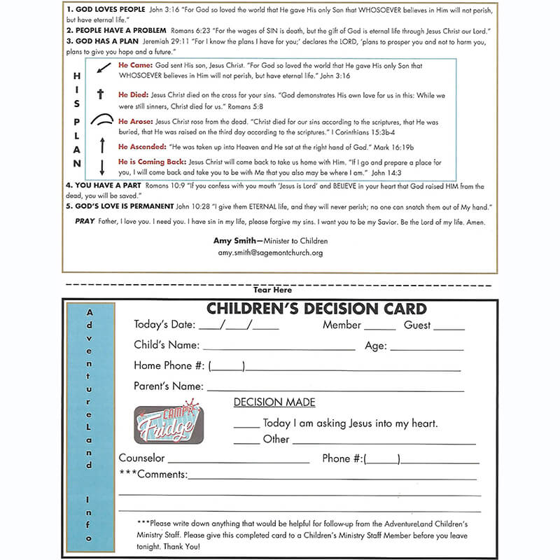 The bottom half functions as a decision card, allowing you to record the child’s information and the decision made for Christ.