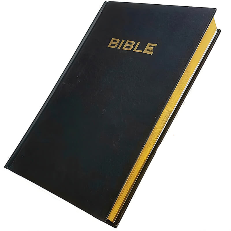 Hardbound book design – black cover with gold “BIBLE” title for realism