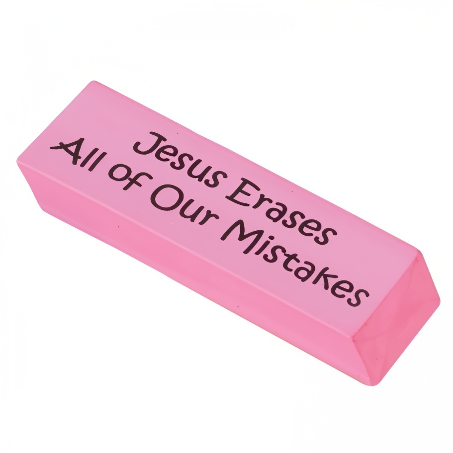 Giant “Jesus Erases All of Our Mistakes” Eraser – Jumbo 5.5″ rubber eraser with an encouraging gospel message. Perfect for gifts, rewards, or giveaways.